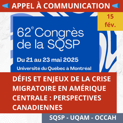 📣 L’OCCAH sera présent lors d’une table ronde au 62e Congrès annuel de la Société québécoise de science politique (SQSP), avec une thématique clé portant sur les défis et enjeux de la crise migratoire en Amérique centrale selon les perspectives canadiennes 📣