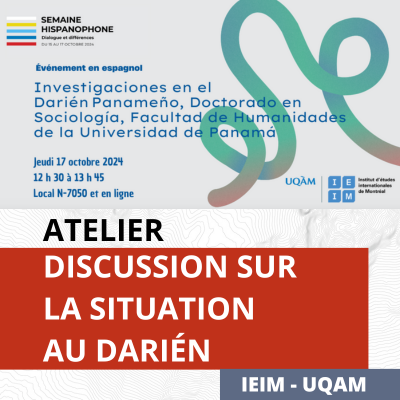 L’Institut d’études internationales de Montréal (IEIM), en collaboration avec la Facultad de Humanidades de la Universidad de Panamá, convie la communauté universitaire à un atelier de discussion portant sur la région du Darién. Organisé dans le cadre de la 14e édition de la Semaine hispanophone de l’UQAM, ce moment d’échanges se tiendra en espagnol et permettra d’aborder divers enjeux politiques et sociétaux qui touchent l’Amérique centrale et qui interpellent les chercheuses et chercheurs de l’UQAM | Université du Québec à Montréal et du Panama.